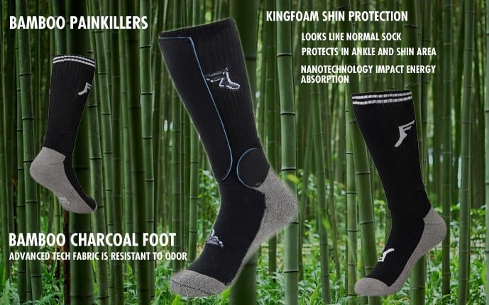 BAMBOO CHARCOAL Painkillers take things to the next level with mildew resistantbambbo charcoal fabric on the foot area. FP MFG Painkillers socks are embedded with Non newtonian Fluid X in the shin and ankle bone areas to protect from shinners… Fluid X is a unique type of memory foam that becomes firm when impacted therefore allowing the socks to be comfortable and form fitting like a normal sock while still being very protective. FP Footwear.