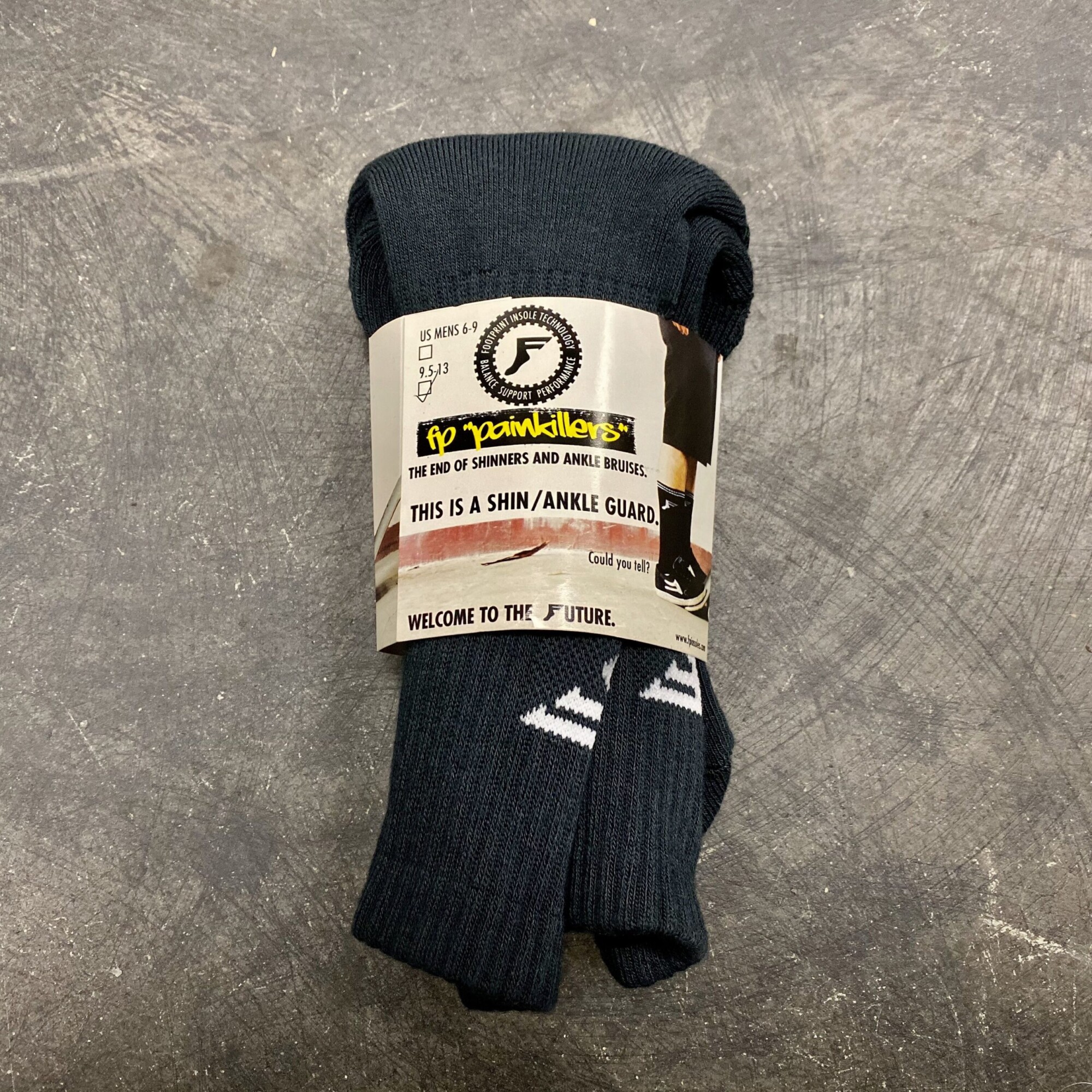 FP MFG Painkillers socks are embedded with Fluid X in the shin and ankle bone areas to protect from shinners… Artilage is a unique type of memory foam that becomes firm when impacted therefore allowing the socks to be comfortable and form fitting like a normal sock while still being very protective. Charcoal Socks.